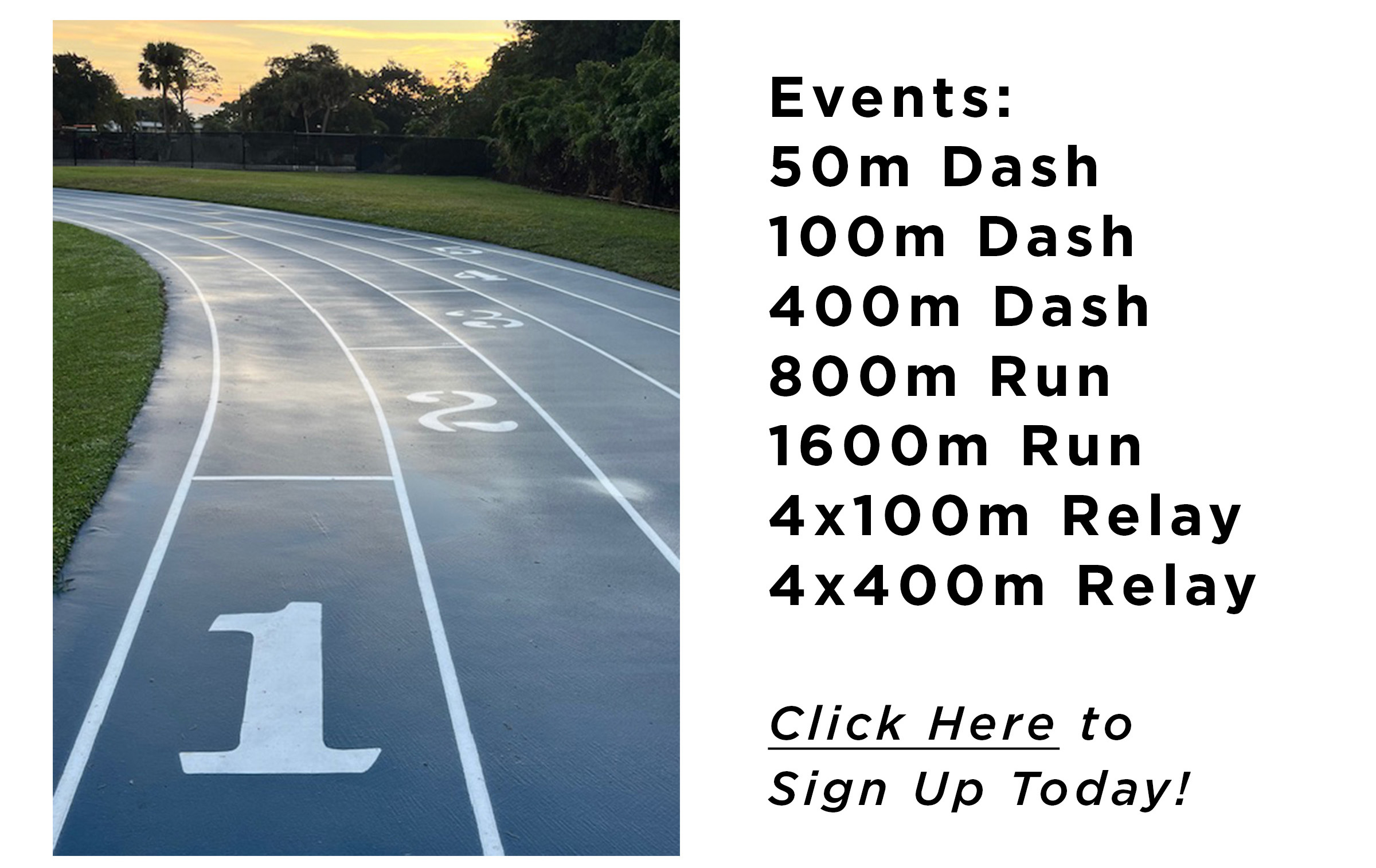 Relay teams will be signed in/verified at the track on race day. Teams must meet age groupings set by race director. Each relay race counts as an individual event in the ‘choose 4 flat fee’ format. Team members – sign up individually online and verify team assignment on race day.