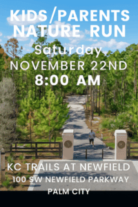Enjoy a Free Kids/Parents Nature Run on Saturday, November 22nd at 8:00 AM at the beautiful KC Trails at Newfield. This family-friendly event invites kids and parents to get outdoors, enjoy the fresh air, and explore Palm City’s scenic trails together. It’s the perfect way to start your Saturday with some movement and nature.