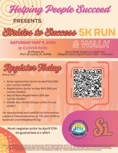 Helping People Succeed is hosting the Strides to Success 5K Run & Walk on Saturday, May 9, 2026 at Clover Park in Port St. Lucie. The run/walk begins at 8:00 AM, with a Kiddie Run at 9:00 AM for children 11 and under. All ages and fitness levels are welcome. Register early to save on the entry fee and be sure to sign up before April 17 to guarantee an event t-shirt. Check out the flyer below for details and registration information. Or go to Helping People Succeed facebook page.